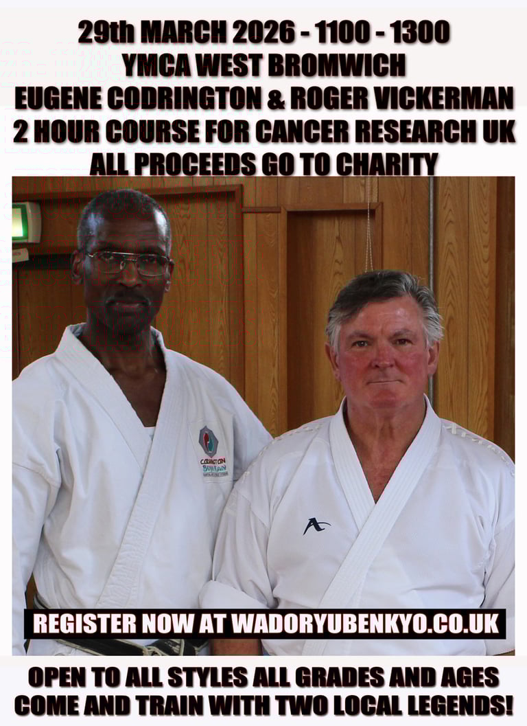 We will be running a 2 hours joint course in support of Cancer Research UK at the YMCA, West Bromwich with Eugene Codrington (8th Dan) and Roger Vickerman Renshi (7th Dan)